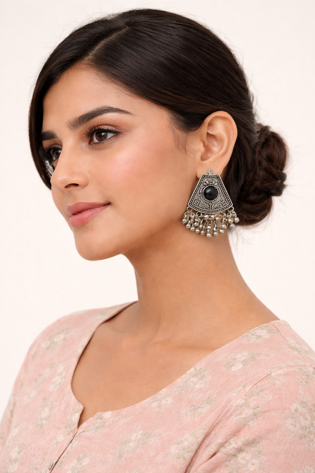 Elevate your jewelry collection with these beautifully handcrafted oxidised silver tribal jhumka earrings, designed to add timeless charm to any look. Featuring an intricately carved triangular frame, these earrings highlight a bold black stone at the center, enhancing their vintage appeal.