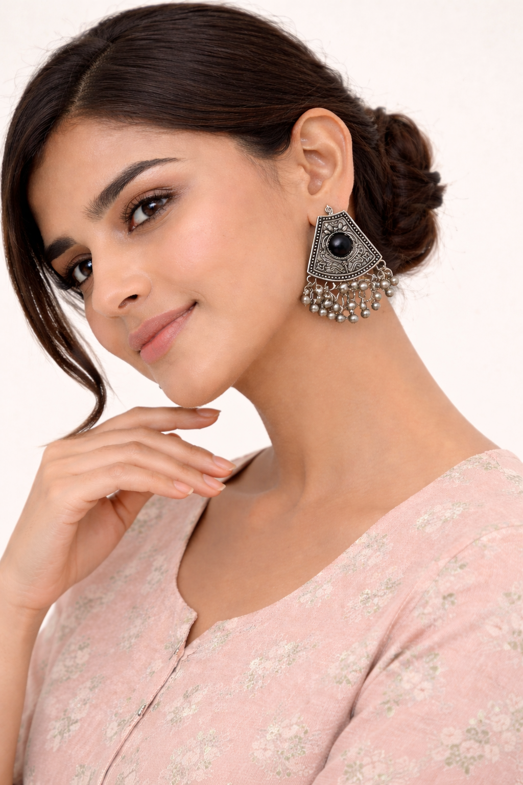 The detailed engraving reflects traditional craftsmanship, while the dangling ghungroo-style beads add graceful movement and a subtle jingle, making them perfect for festive occasions, weddings, and everyday ethnic wear. Lightweight yet statement-worthy, these earrings are comfortable for all-day wear.
