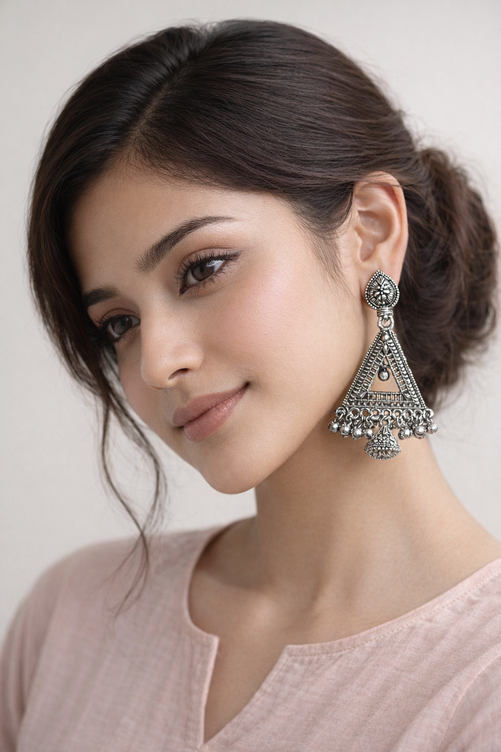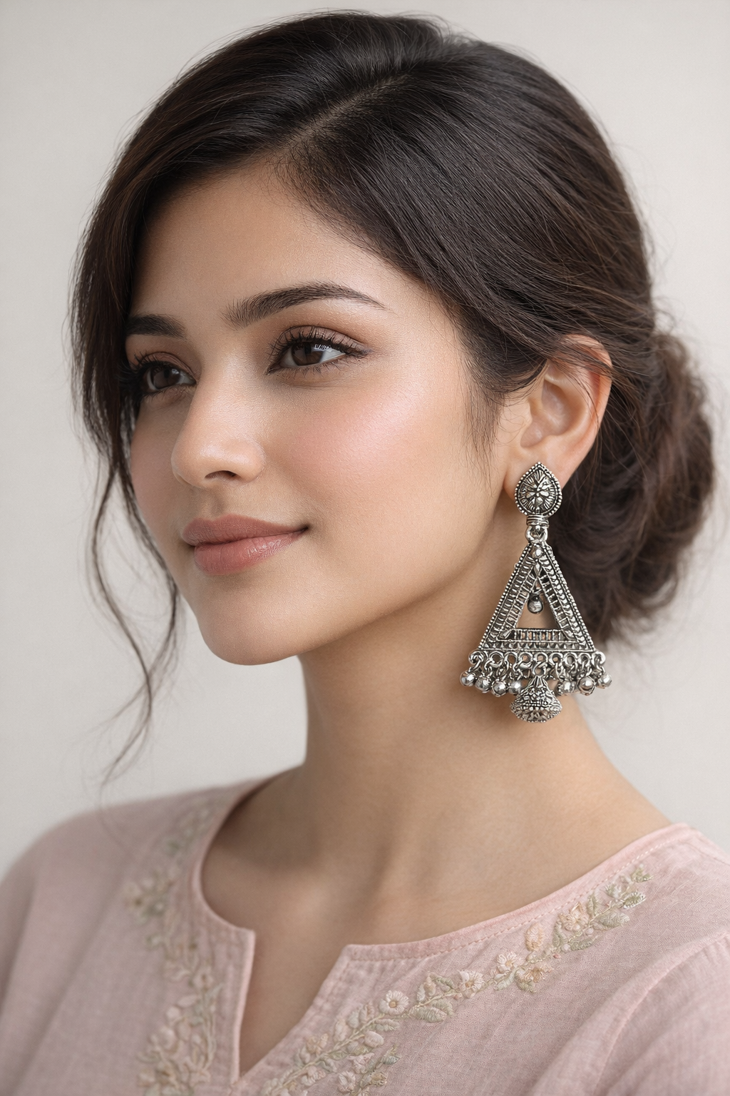 Elevate your ethnic look with these stunning oxidized silver triangle jhumka earrings. Featuring intricate tribal detailing and delicate ghungroo drops, they add a bold yet elegant touch to any outfit. Perfect for festive wear, casual styling, and statement looks. Lightweight and comfortable for all-day wear.