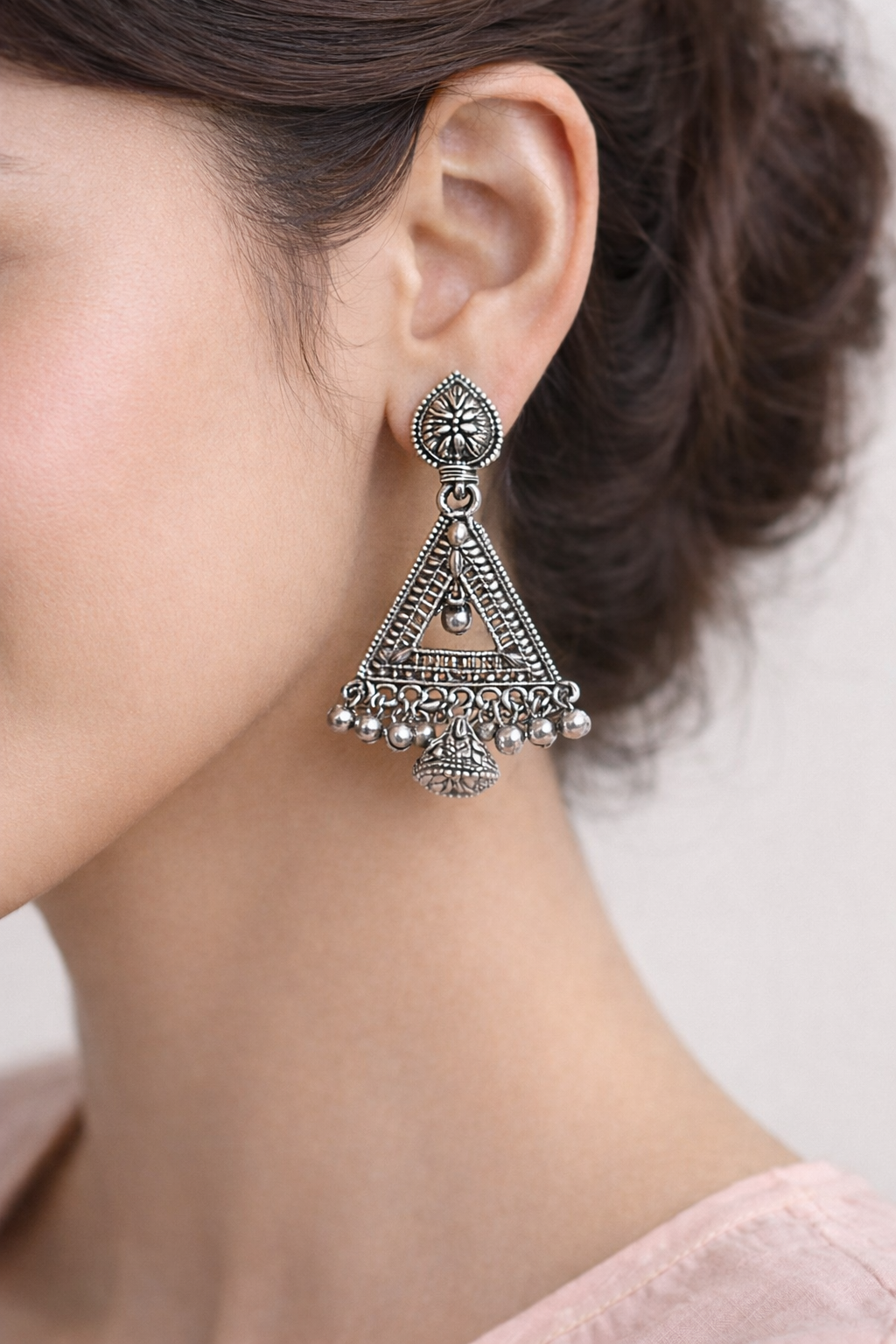 The top stud features a floral motif that seamlessly connects to a geometric triangular structure, adorned with fine patterns and delicate hanging ghungroos that create subtle movement and grace. The oxidized silver finish enhances its antique appeal, making it a perfect accessory for ethnic outfits like sarees, kurtis, and lehengas, as well as fusion wear.